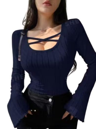 Latest Long Sleeve Plain Cutout Ribbed Knit Top for Girls | Stylish Lycra Casual Wear Crop Tee
