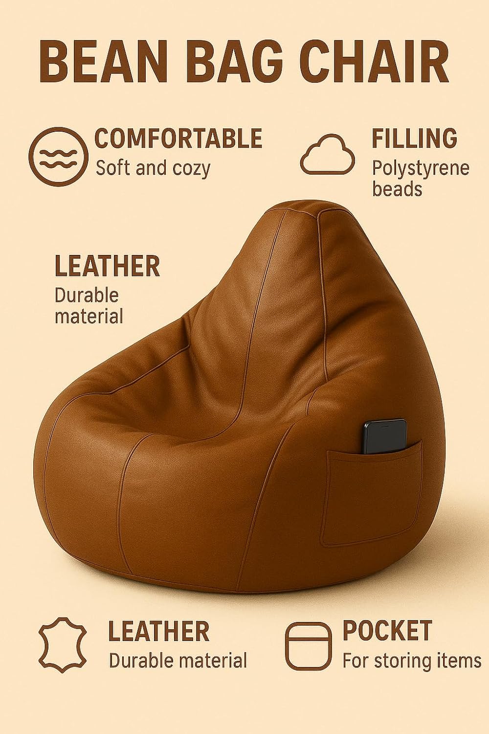 Bean Bag Chair | Ergonomic Gaming Seat, Premium Leatherette, Washable Cover, Durable Double Stitching | Perfect for Lounge & Bedroom Side Mobile Pocket with Filler (Tan, XL)