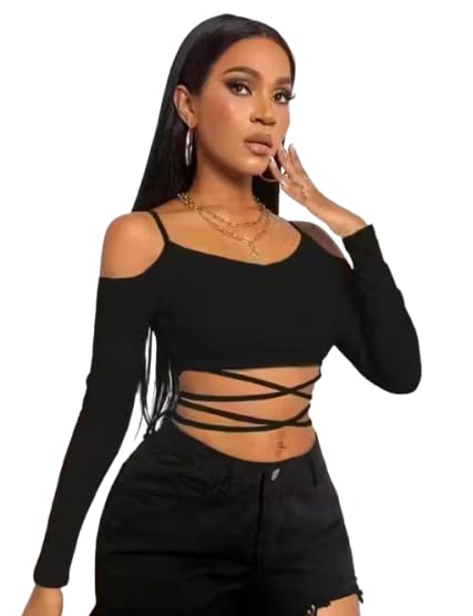 S V Enterprises Trendy Cold Shoulder Crisscross Tie Back Crop Top for Girls & Women | Lycra Fabric | Stylish Long Sleeve Casual Wear Color Black